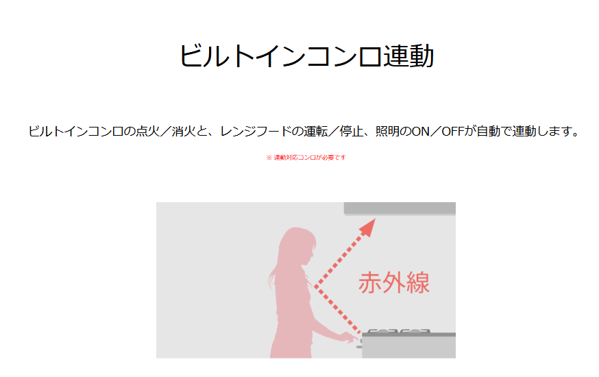 IHやガスコンロのスイッチON/OFFや火力に合わせ、レンジフードが自動でON/OFFや風量調節をしてくれます。
