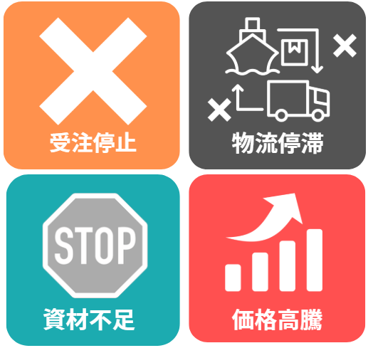 現在、原材料不足や物流の混乱から、多くのメーカー各社において以下のような影響が出ております。